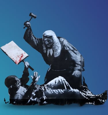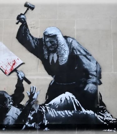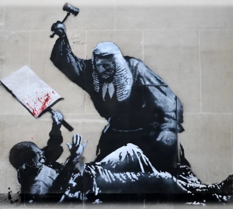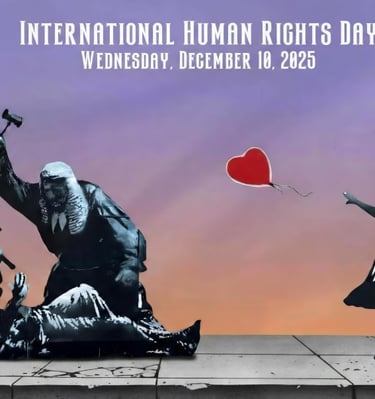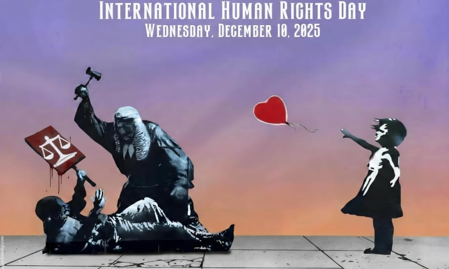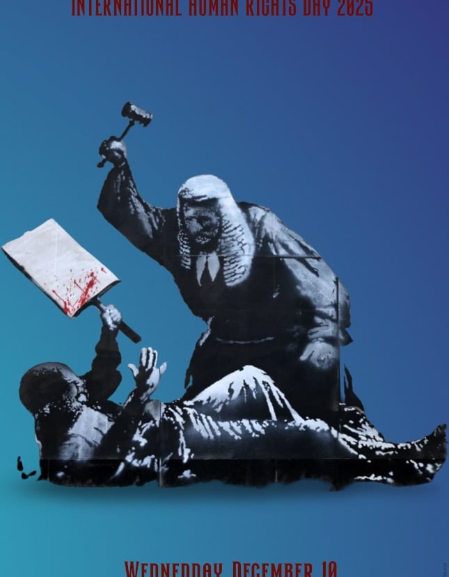 “The posters for the 2025 International Human Rights Day were created by an artist who wishes to remain anonymous. This artist donated them to us so that we could offer our support to those who wish for—and work toward—a better world. We are simply adding our small drop of water, inspired by the monumental work that Banksy created at the Royal Courts of Justice in London, which will remain engraved in history. Thank you!”