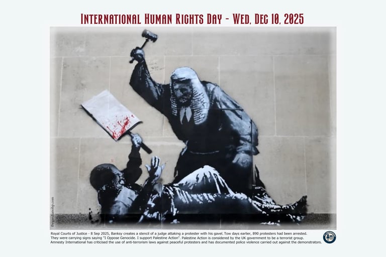 Le 8 septembre 2025, Banksy crée un pochoir représentant un juge frappant un manifestant avec son marteau. Deux jours plus tôt, 890 manifestants avaient été arrêtés. Ils portaient des pancartes sur lesquelles on pouvait lire « Je m'oppose au génocide. Je soutiens Palestine Auction ». Palestine Auction est considéré comme un groupe terroriste par le gouvernement britannique. Amnesty International a critiqué l'utilisation des lois antiterroristes contre des manifestants pacifiques et a documenté les violences policières commises à l'encontre des manifestants.